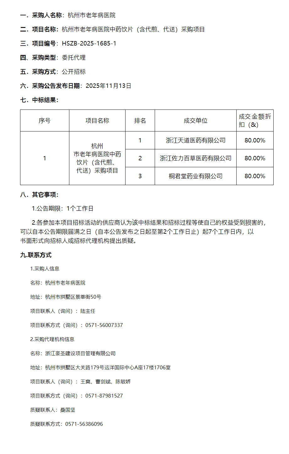 【杭州市老年病医院】浙江豪圣建设项目管理有限公司关于杭州市老年病医院中药饮片(含代煎、代送)采购项目的中标(成交)结果公告