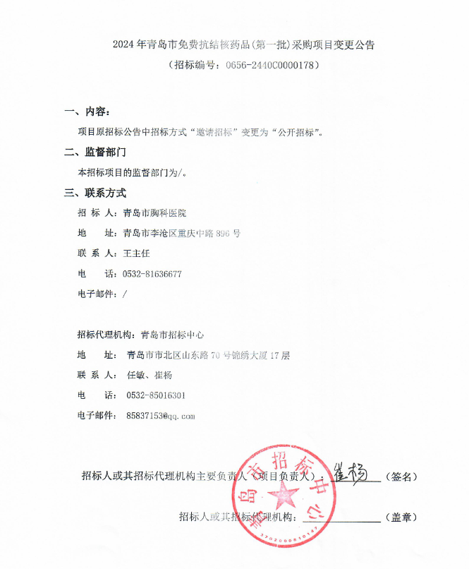 【青岛市胸科医院】山东省2024年青岛市免费抗结核药品(第一批)采购项目变更公告