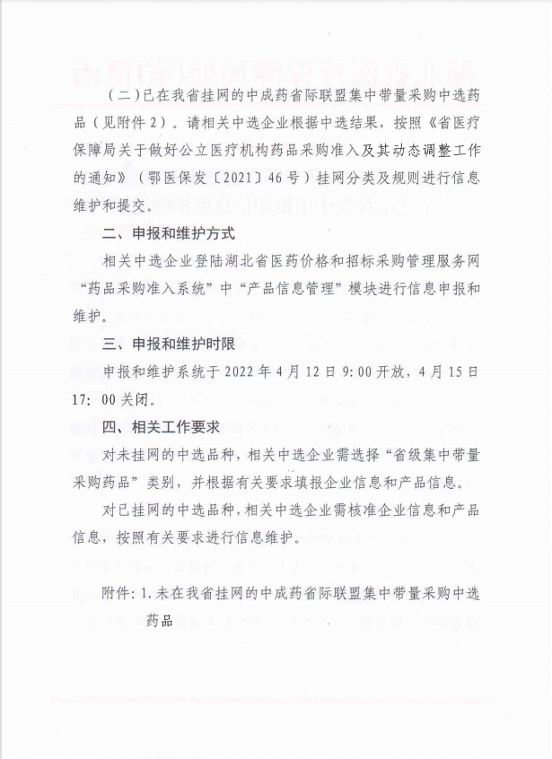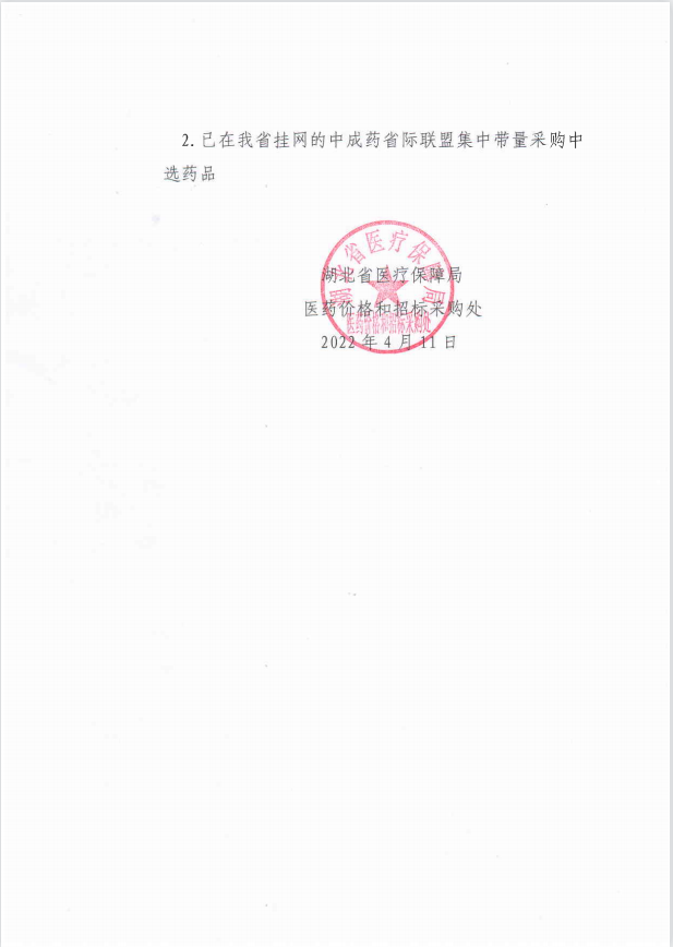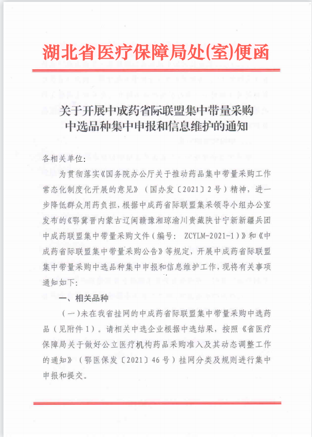 【湖北】湖北省关于开展中成药省际联盟集中带量采购中选品种集中申报和信息维护的通知
