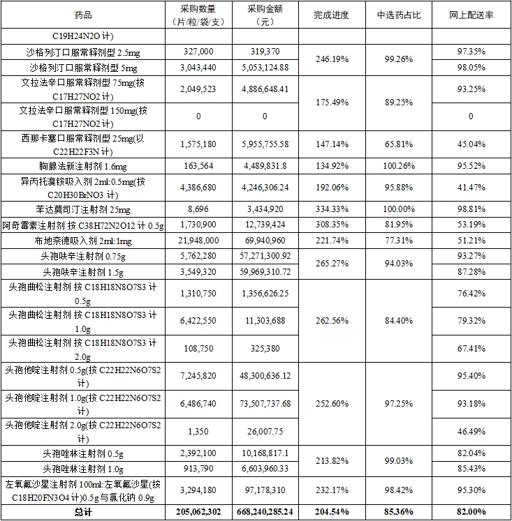(二)中选药完成进度和占比。全省中选药品采购总数量占约定采购总量的比例为204.54%,占同品规所有药品采购总数量的比例为85.36%。