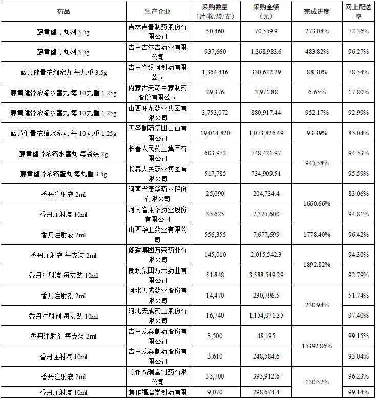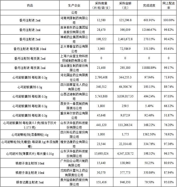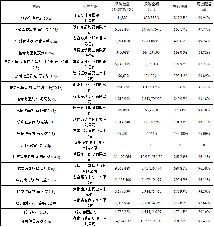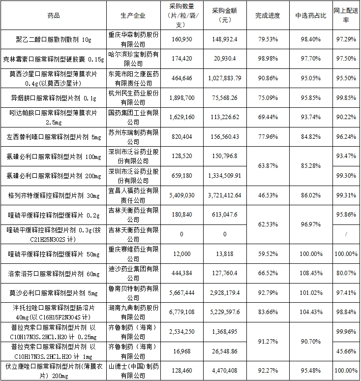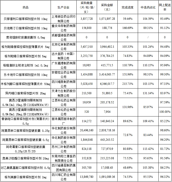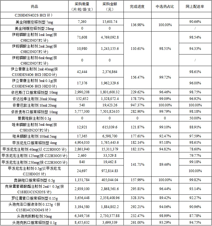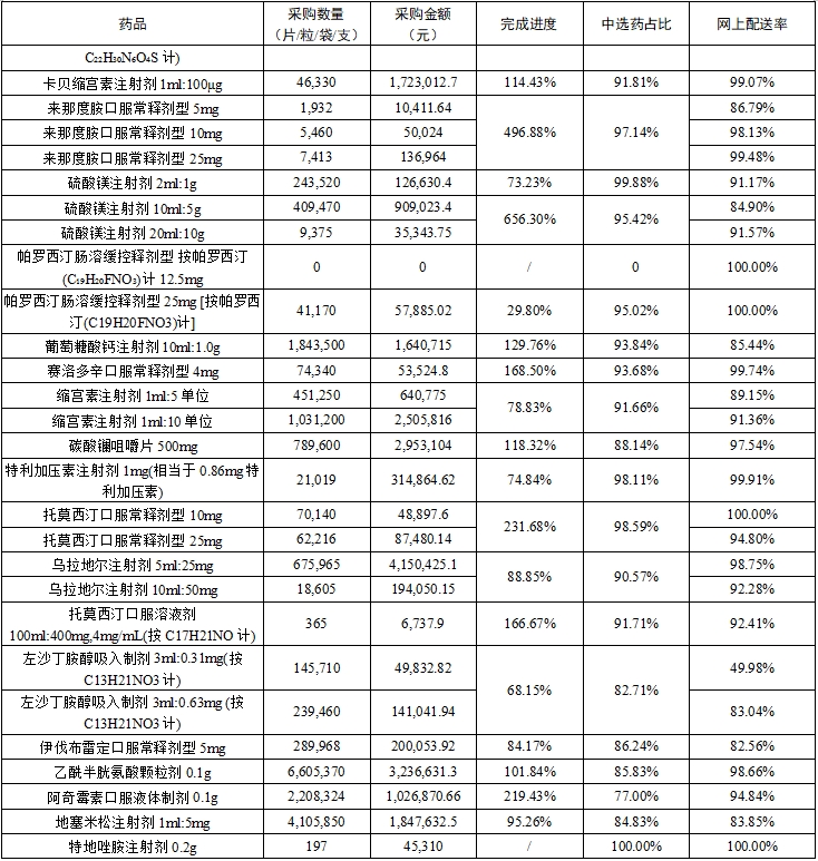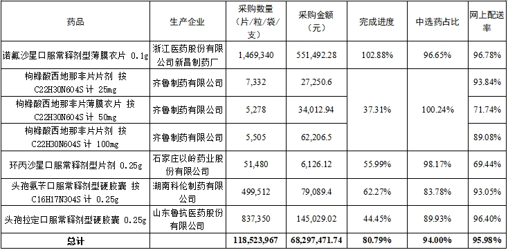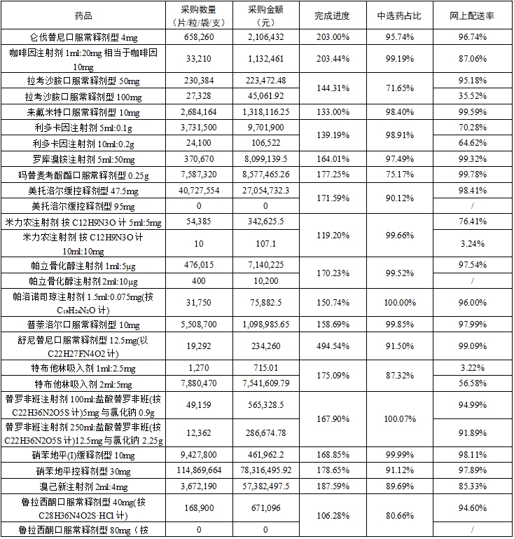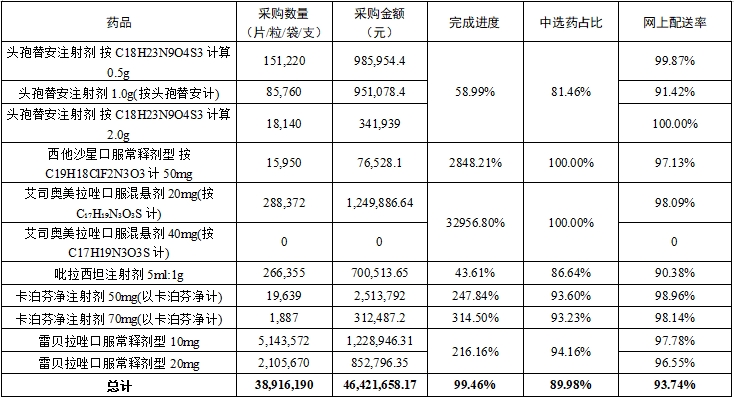 (二)中选药完成进度和占比。全省中选药品采购总数量占约定采购总量的比例为80.79%,占同品规所有药品采购总数量的比例为94.0%。