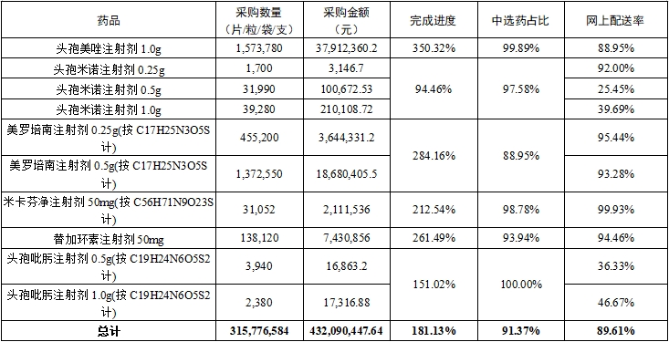 (二)中选药完成进度和占比。全省中选药品采购总数量占约定采购总量的比例为181.13%,占同品规所有药品采购总数量的比例为91.37%。