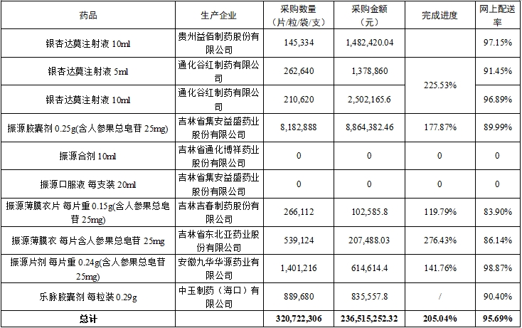(二)中选药完成进度。全省中选药品采购总数量占约定采购总量的比例为205.04%。