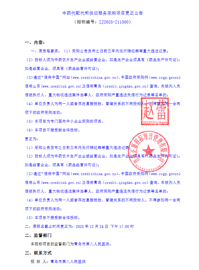 【青岛市第八人民医院】山东省青岛市第八人民医院中药代配代煎供应服务采购项目更正公告
