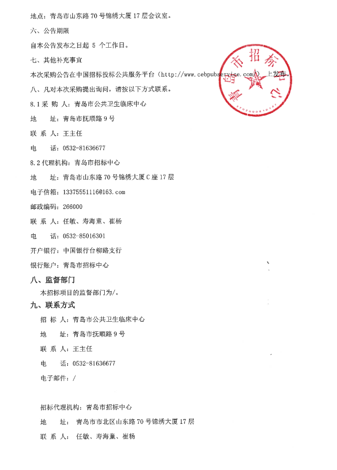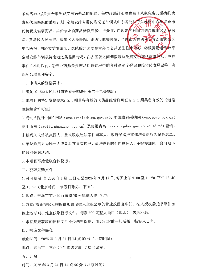 【青岛市公共卫生临床中心】山东省青岛市免费艾滋病药品配送服务采购项目招标公告