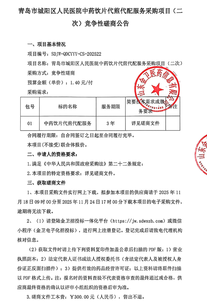 【青岛市城阳区人民医院】山东省青岛市城阳区人民医院中药饮片代煎代配服务采购项目(二次)竞争性磋商公告
