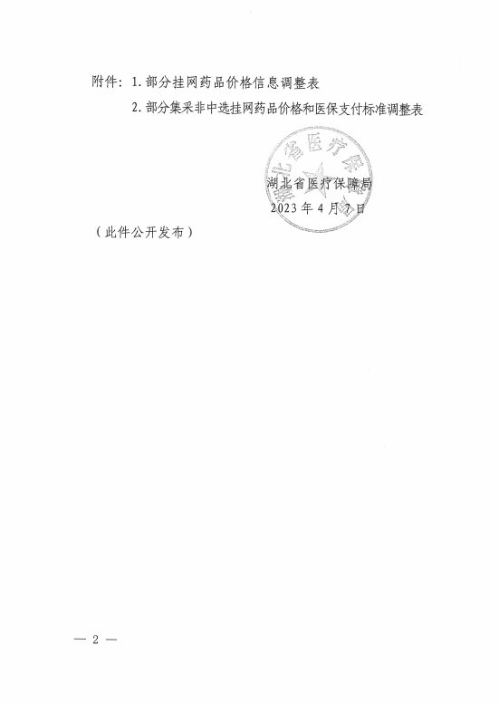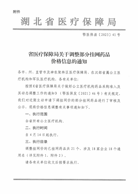现将《省医疗保障局关于调整部分挂网药品价格信息的通知》(鄂医保函[2023] 41号)转发给你们,请各有关单位于4月14日起按要求执行。