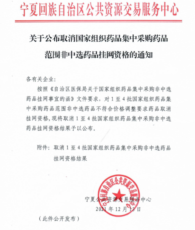 【宁夏】宁夏回族自治区关于公布取消国家组织药品集中采购药品范围非中选药品挂网资格的通知
