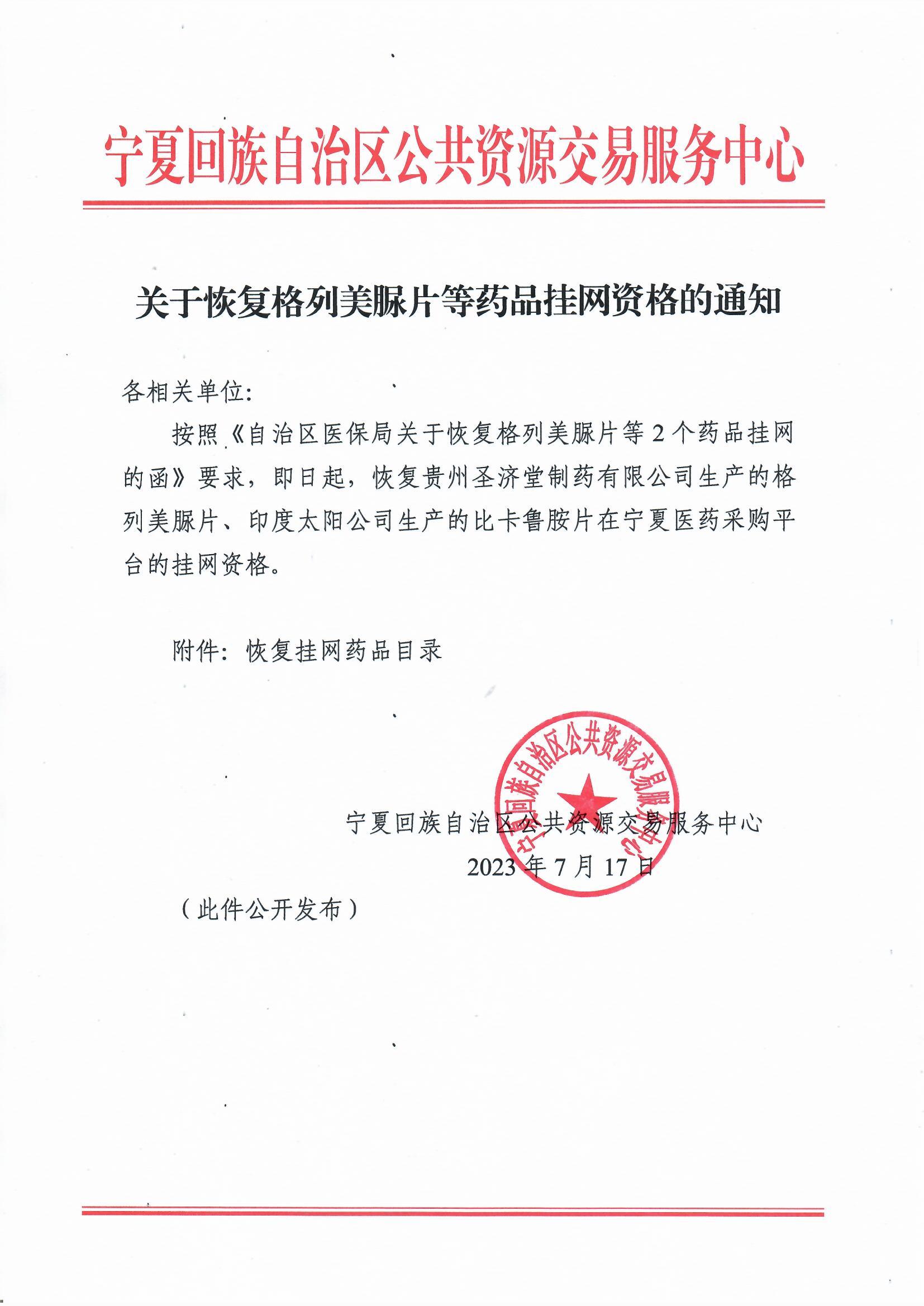 按照《自治区医保局关于恢复格列美脲片等2个药品挂网的函》要求,即日起,恢复贵州圣济堂制药有限公司生产的格列美脲片、印度太阳公司生产的比卡鲁胺片在宁夏医药采购平台的挂网资格。