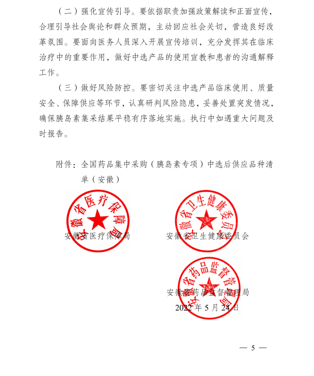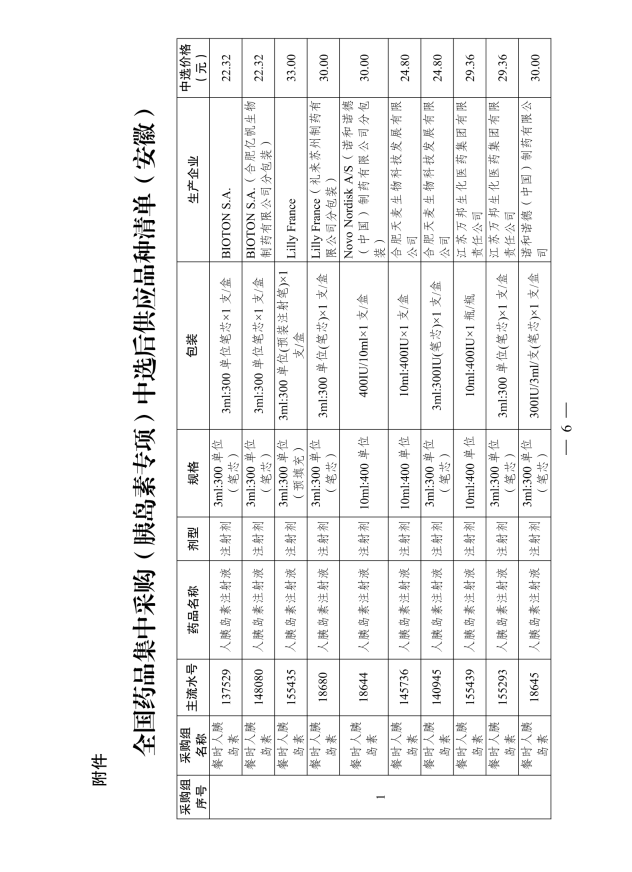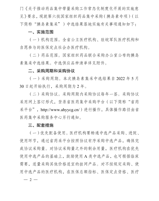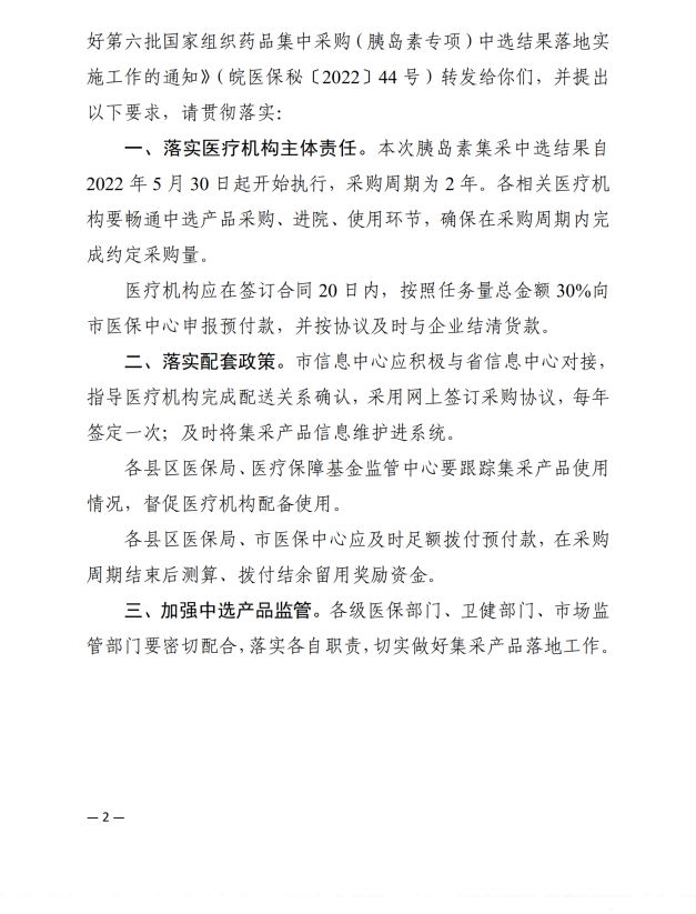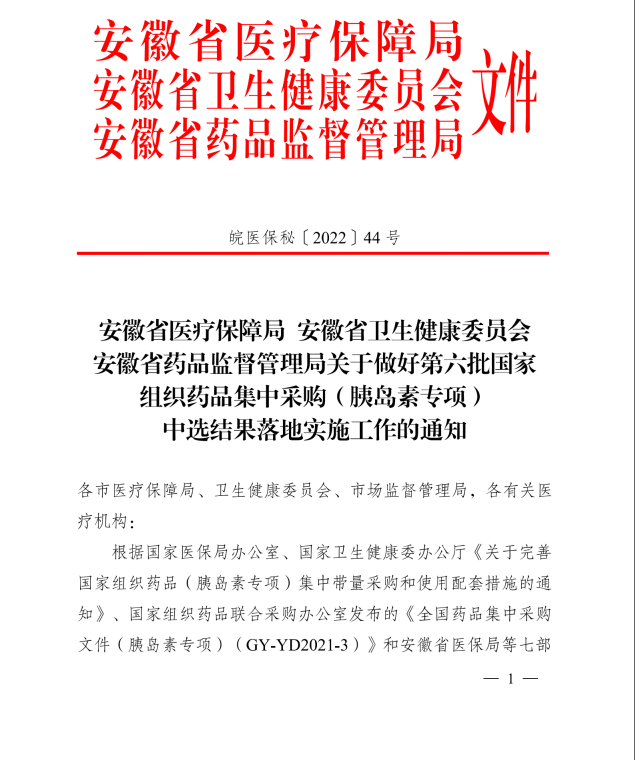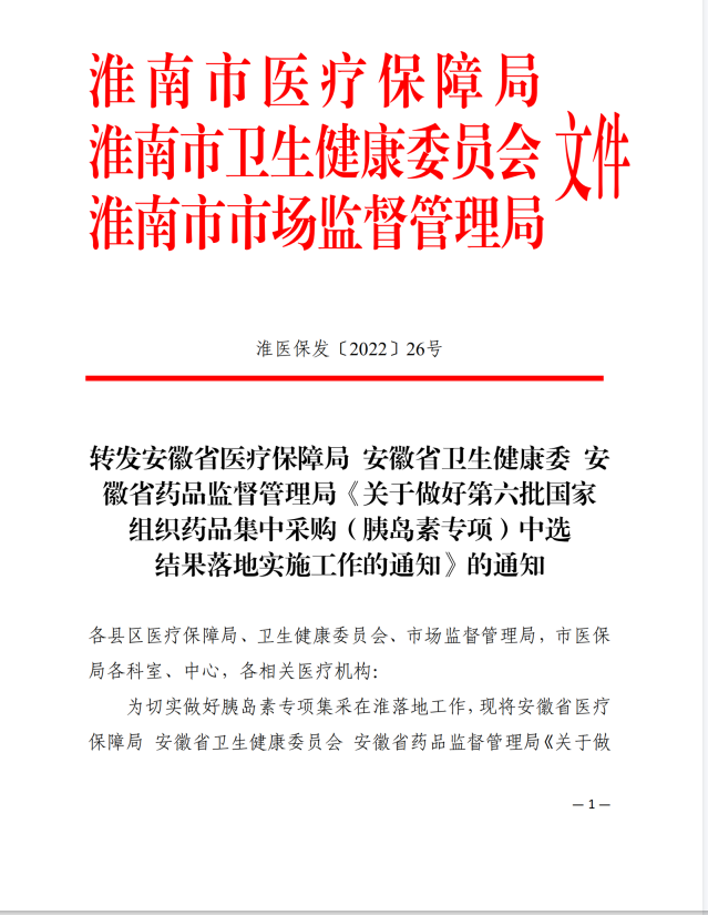 【淮南】安徽省淮南市转发安徽省医疗保障局安徽省卫生健康委安徽省药品监督管理局《关于做好第六批国家组织药品集中采购(胰岛素专项)中选结果落地实施工作的通知》的通知