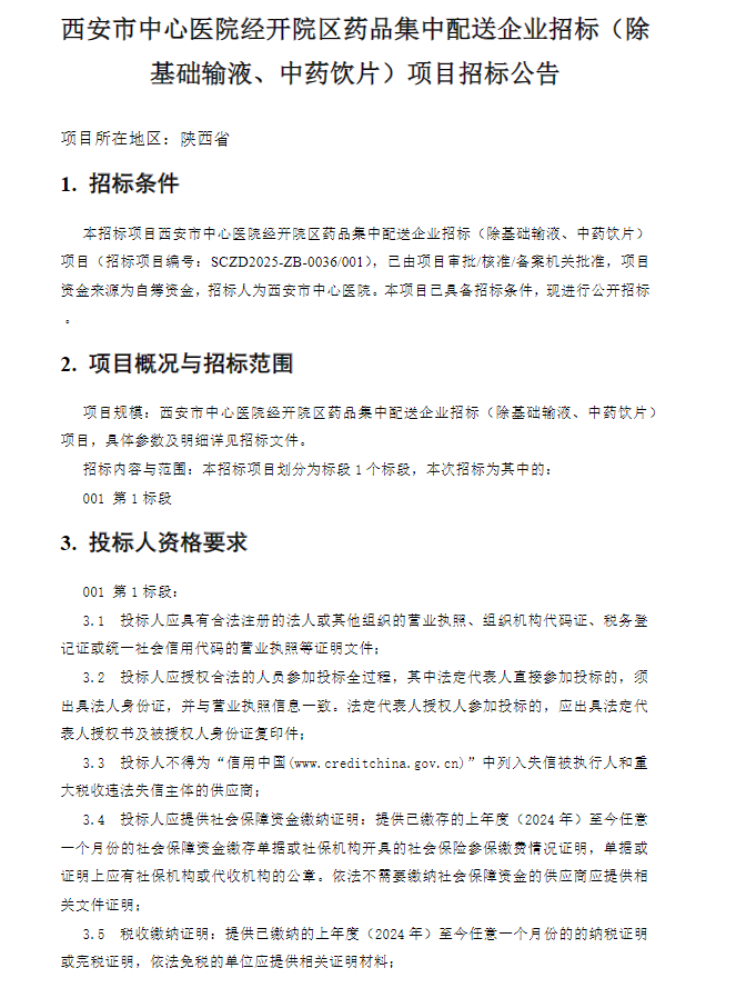 【西安市中心医院】陕西省西安市中心医院经开院区药品集中配送企业招标(除基础输液、中药饮片)项目-公开招标公告