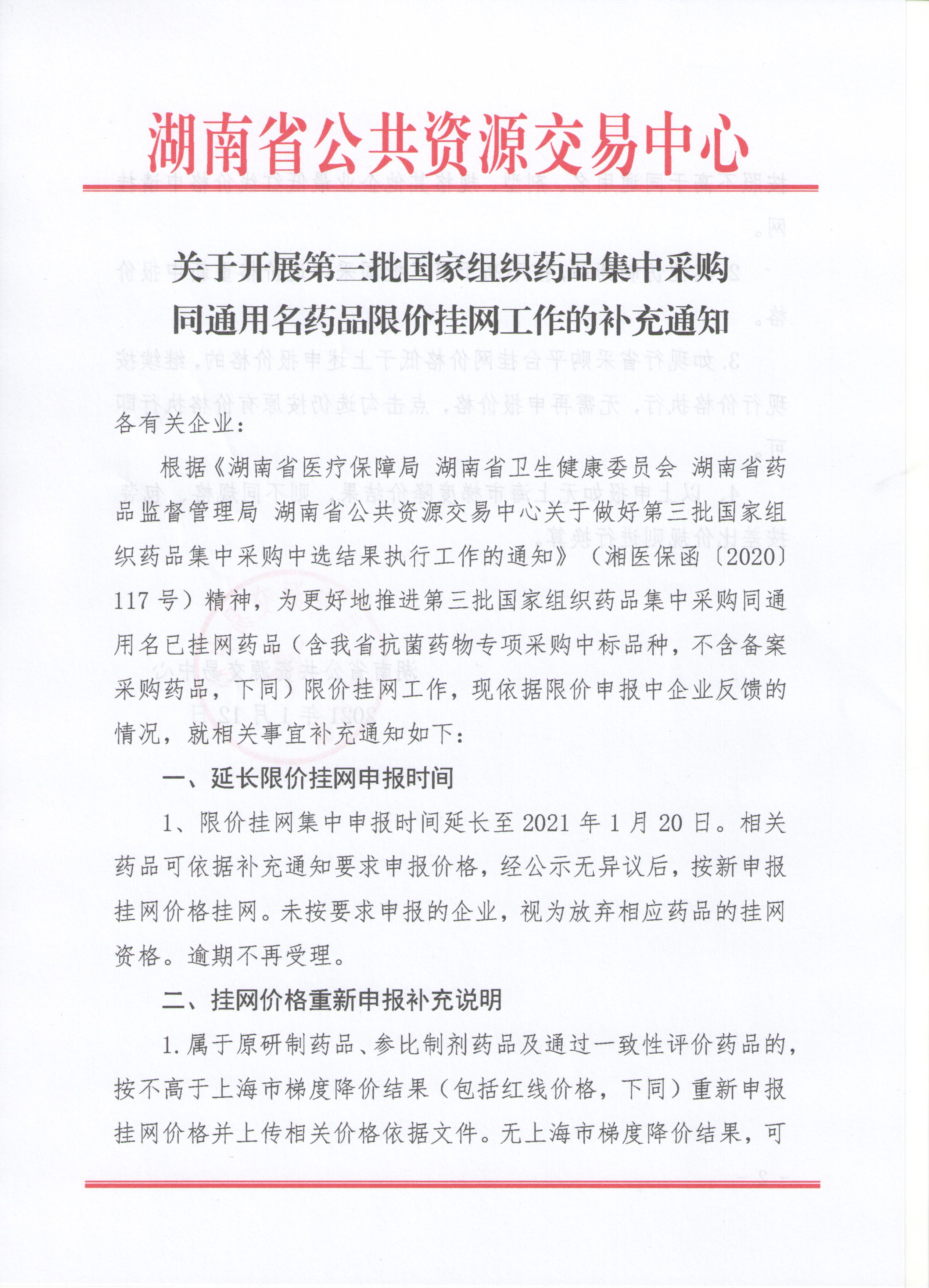 【湖南】2021年湖南省关于开展第三批国家组织药品集中采购同通用名药品限价挂网工作的补充通知