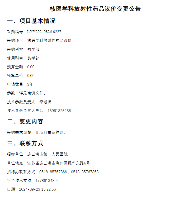 【连云港市第一人民医院】江苏省连云港市第一人民医院核医学科放射性药品议价变更公告