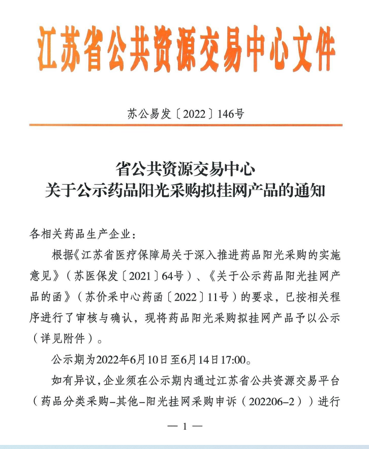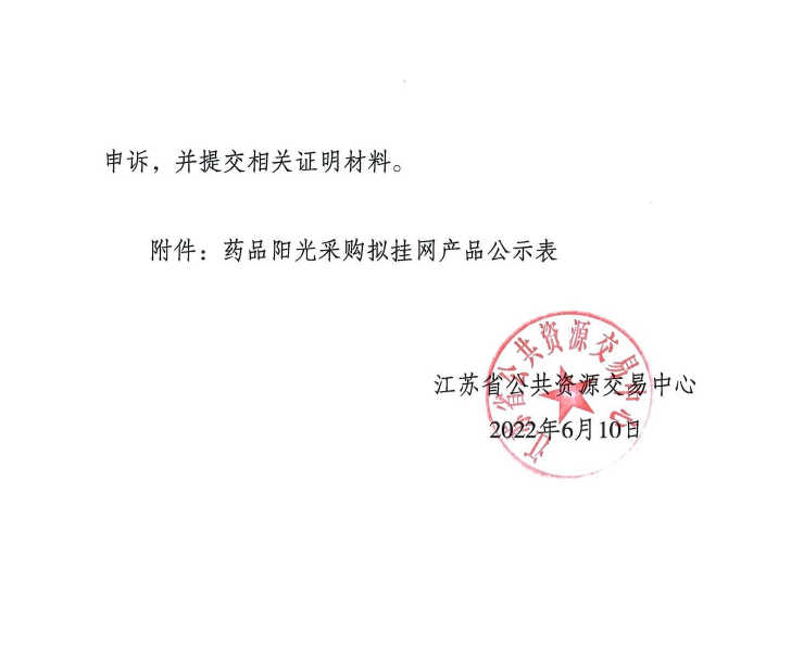【江苏】江苏省省公共资源交易中心关于公示药品阳光采购拟挂网产品的通知(20220610)