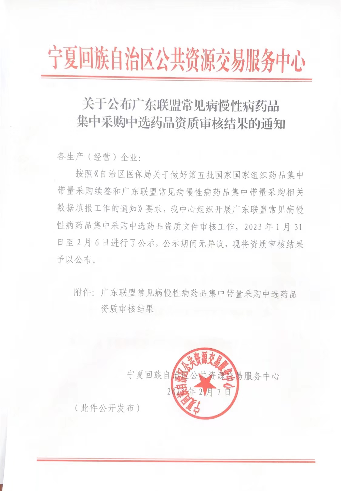 【宁夏】关于公布广东联盟常见病慢性病药品集中采购中选药品资质审核结果的通知