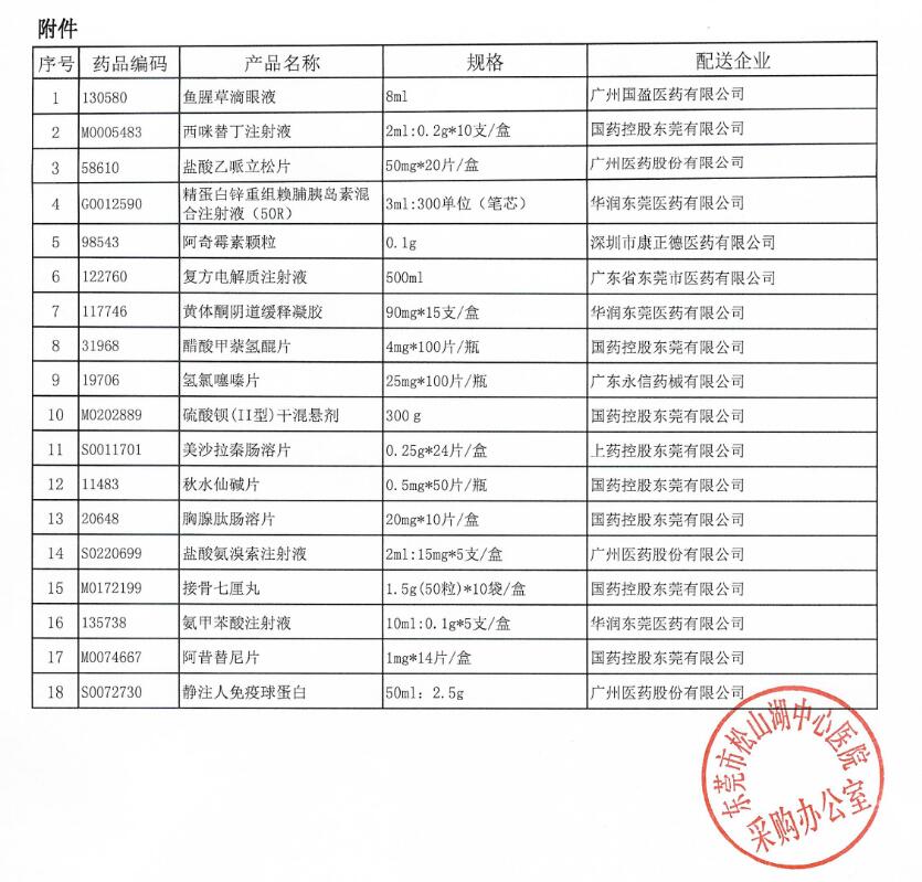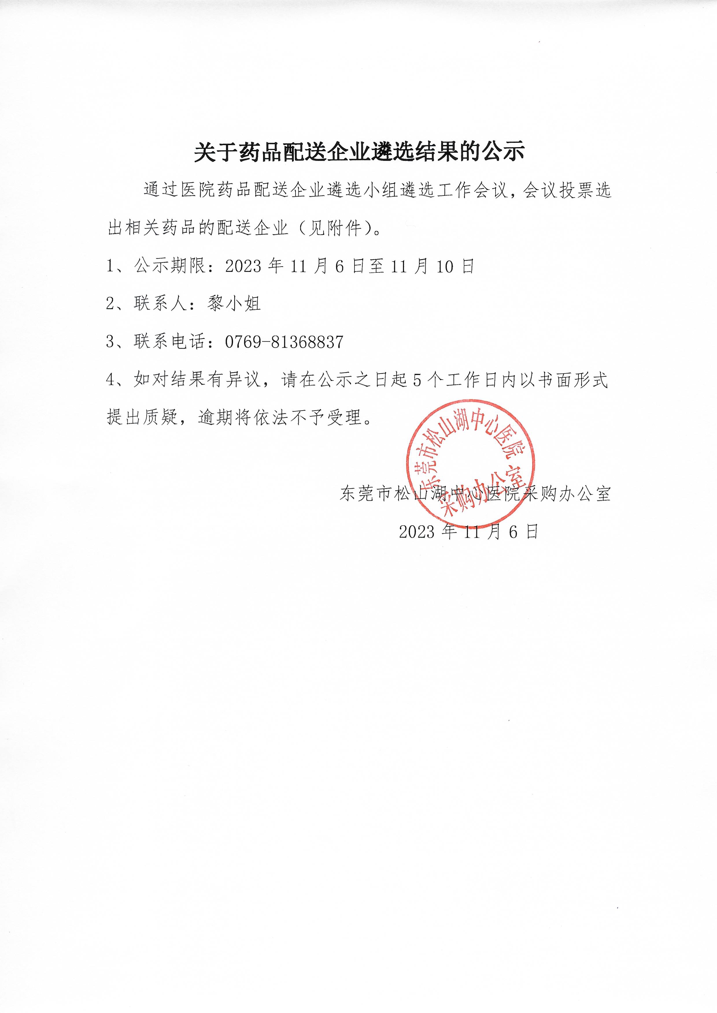 【东莞市松山湖中心医院】广东省东莞市松山湖中心医院关于药品配送企业遴选结果的公示(2023.11.6)