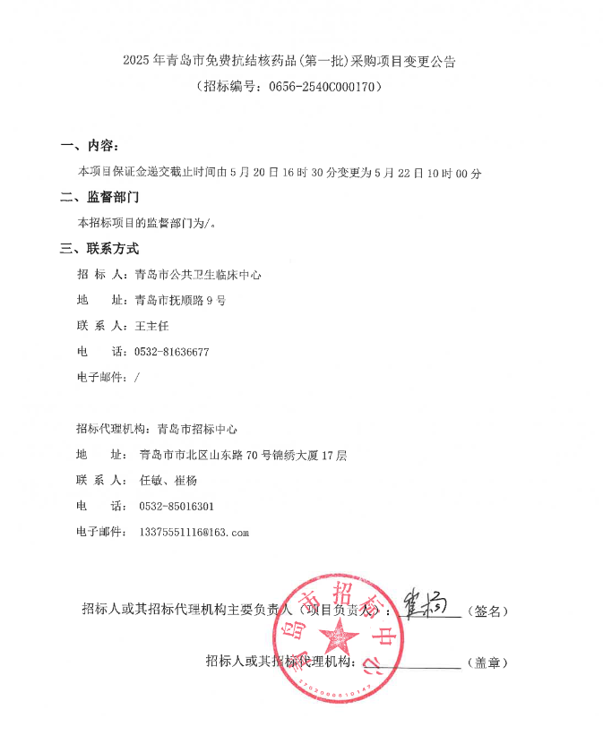 【青岛市公共卫生临床中心】山东省2025年青岛市免费抗结核药品(第一批)采购项目变更公告
