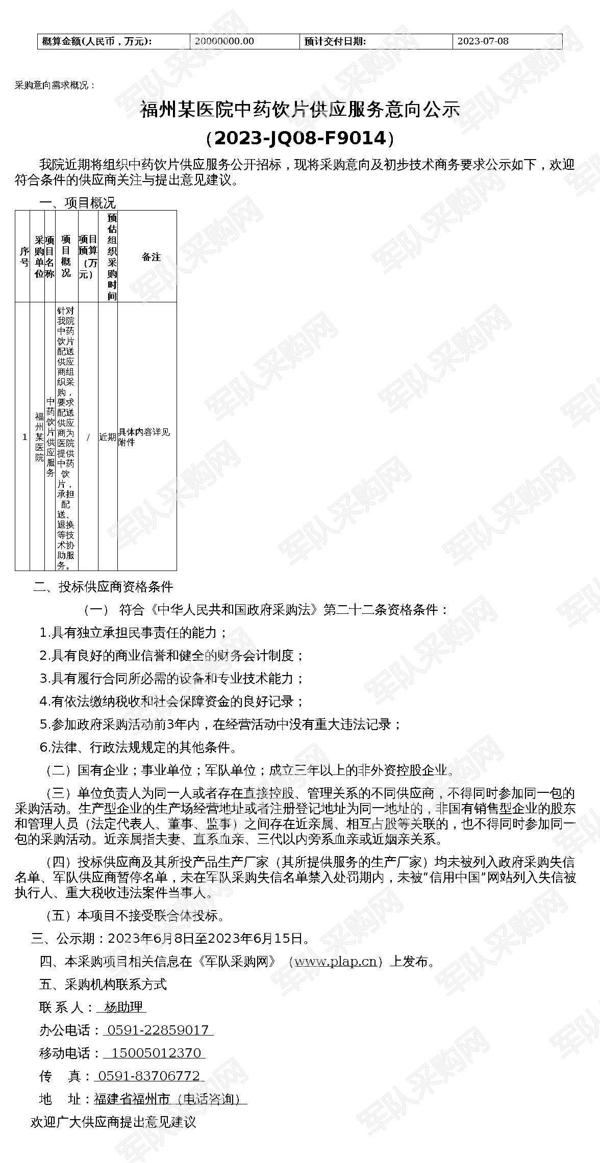 【福州某医院】军队采购网福州某医院中药饮片供应服务意向公示(2023-JQ08-F9014)