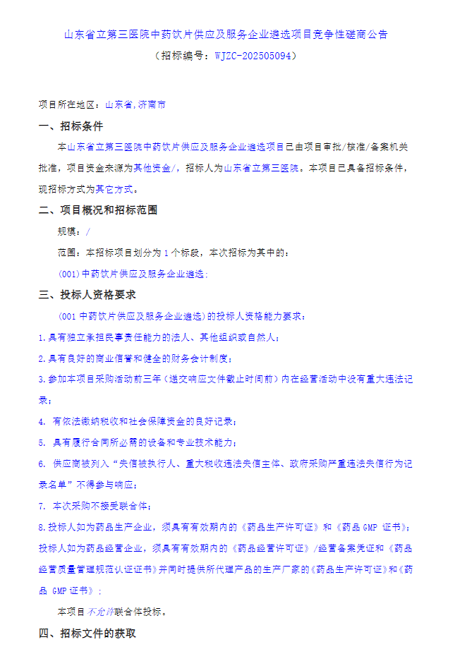 【山东省立第三医院】山东省立第三医院中药饮片供应及服务企业遴选项目竞争性磋商公告