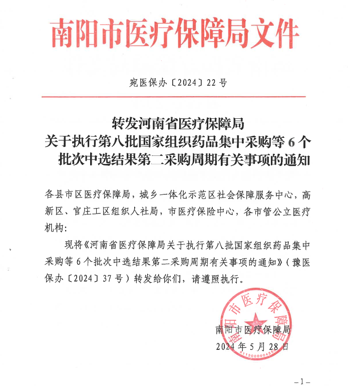 【南阳】宛医保办[2024]22号转发河南省医疗保障局关于执行第八批国家组织药品集中采购等6个批次中选结果第二采购周期有关事项的通知