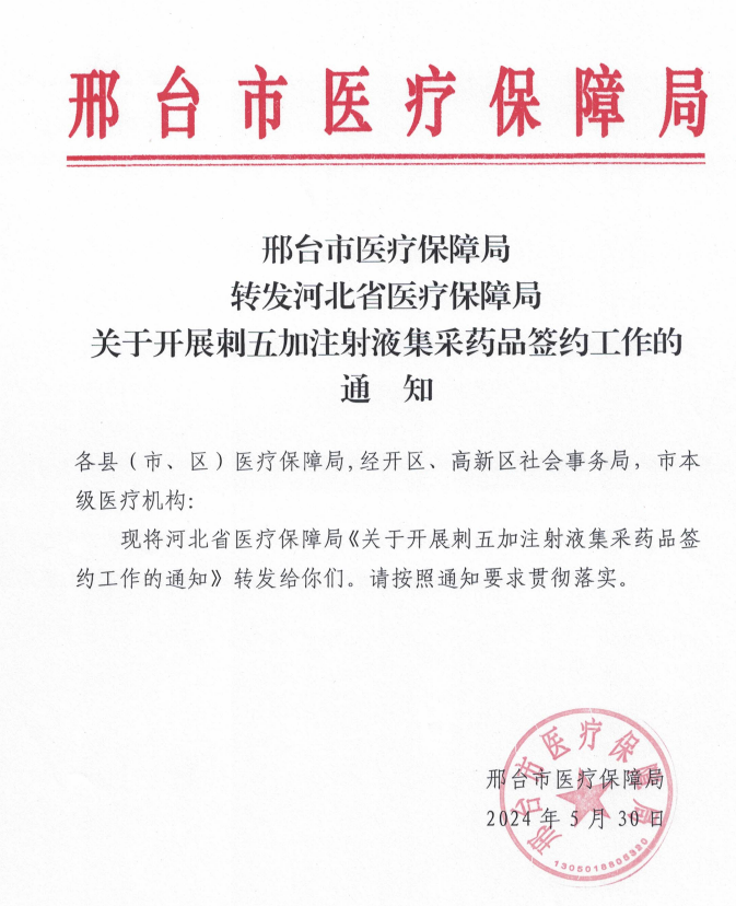 【邢台】邢台市医疗保障局转发河北省医疗保障局关于开展刺五加注射液集采药品签约工作的通知