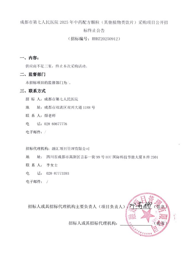 【成都市第七人民医院】四川省成都市第七人民医院2025年中药配方颗粒(其他植物类饮片)采购项目公开招标终止公告