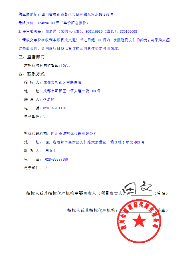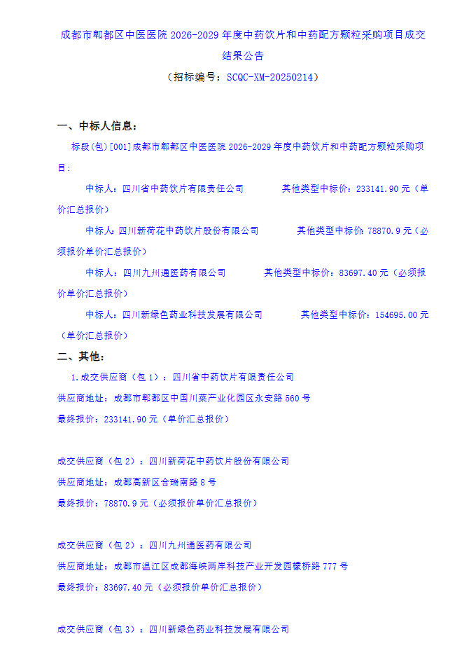 【成都市郫都区中医医院】四川省成都市郫都区中医医院2026-2029年度中药饮片和中药配方颗粒采购项目成交结果公告