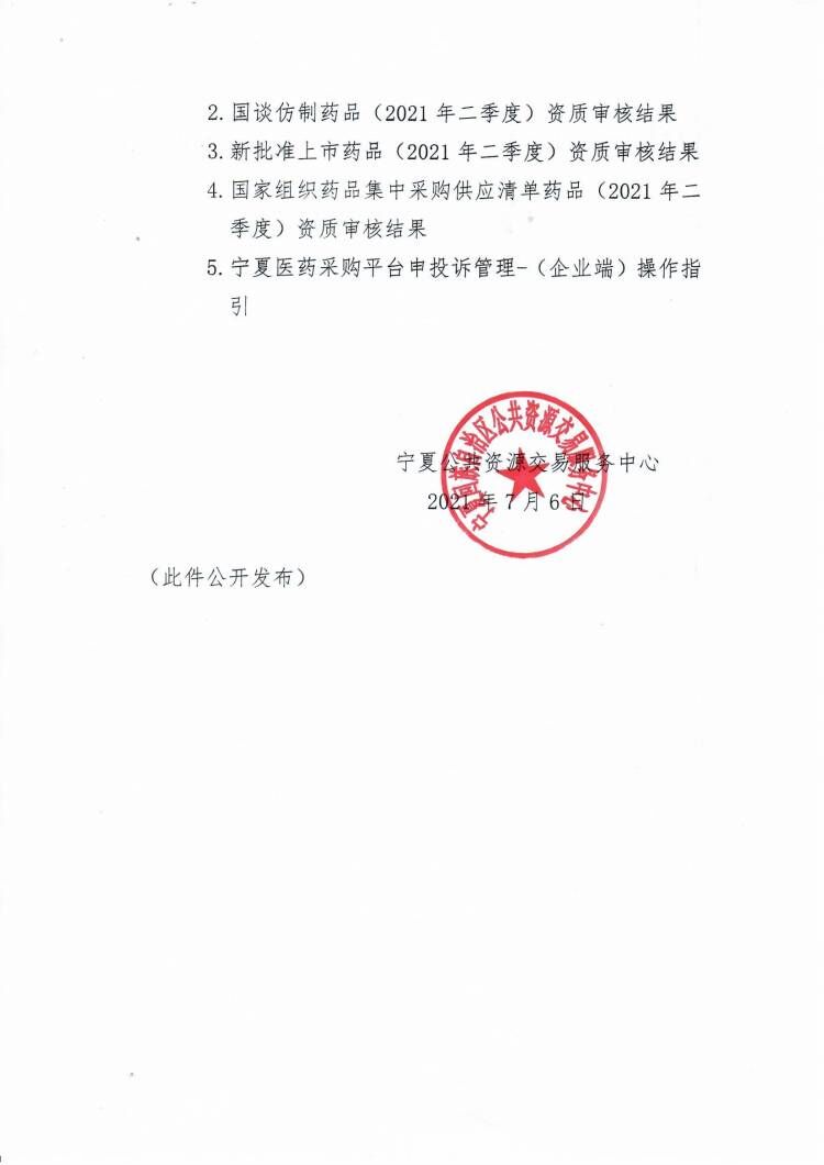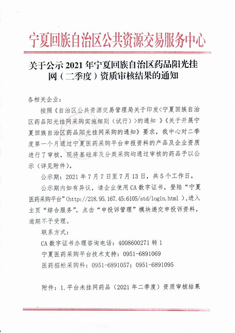 【宁夏】2021年宁夏自治区关于公示2021年宁夏回族自治区药品阳光挂网(二季度)资质审核结果的通知