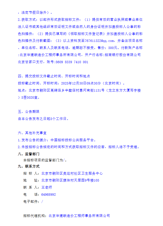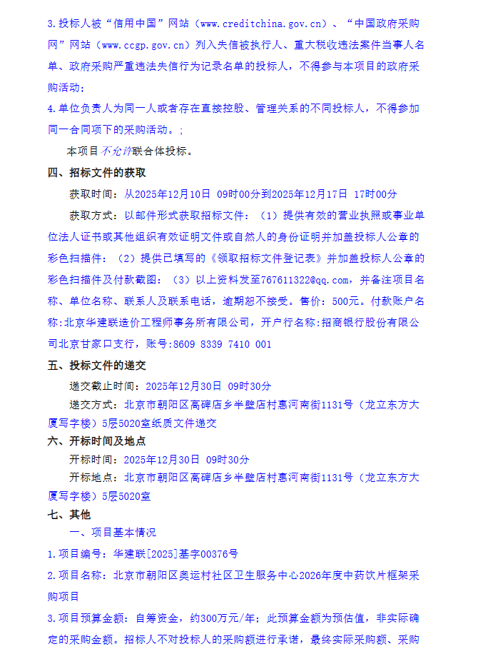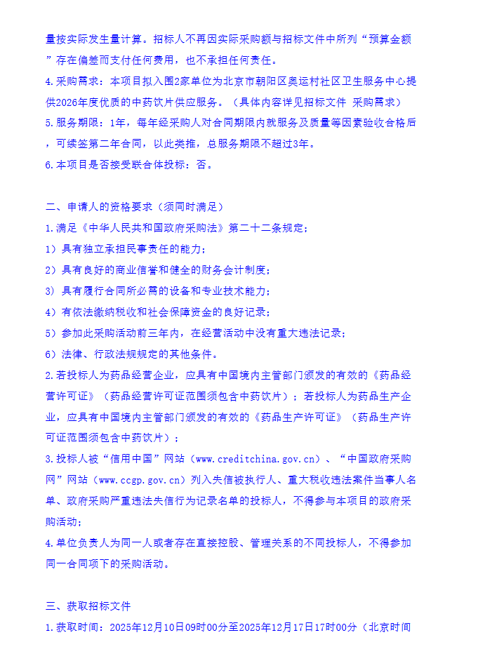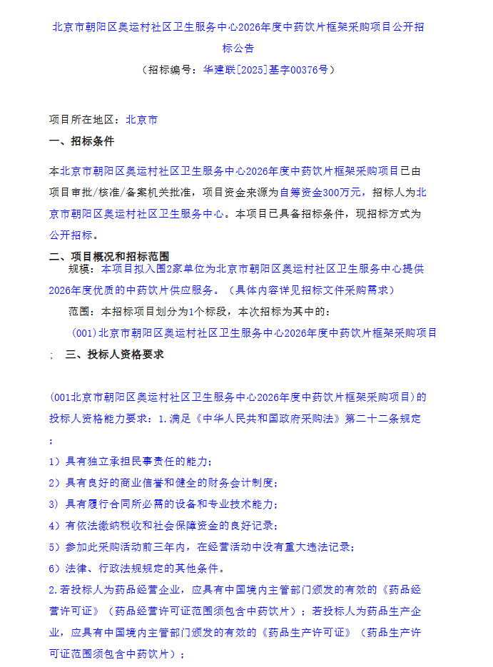 【北京市朝阳区奥运村社区卫生服务中心】北京市朝阳区奥运村社区卫生服务中心2026年度中药饮片框架采购项目公开招标公告