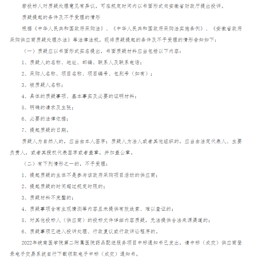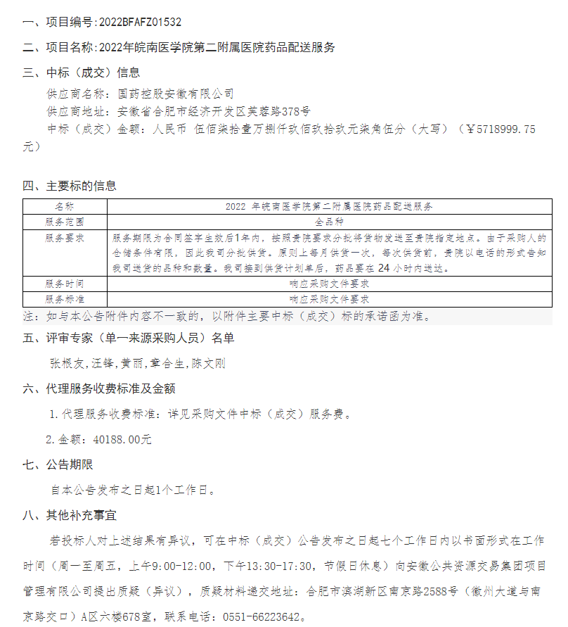 【皖南医学院第二附属医院】安徽省芜湖市2022年皖南医学院第二附属医院药品配送服务中标(成交)结果公告