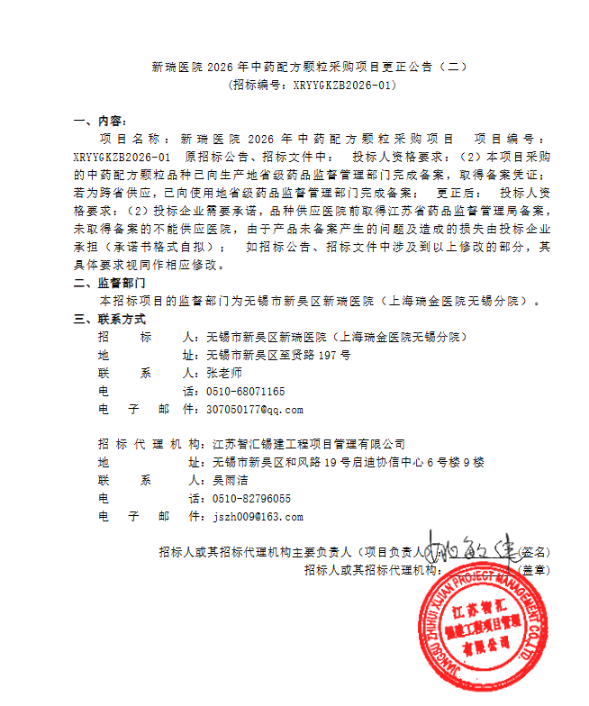 【无锡市新瑞医院】江苏省无锡市新瑞医院2026年中药配方颗粒采购项目更正公告(二)