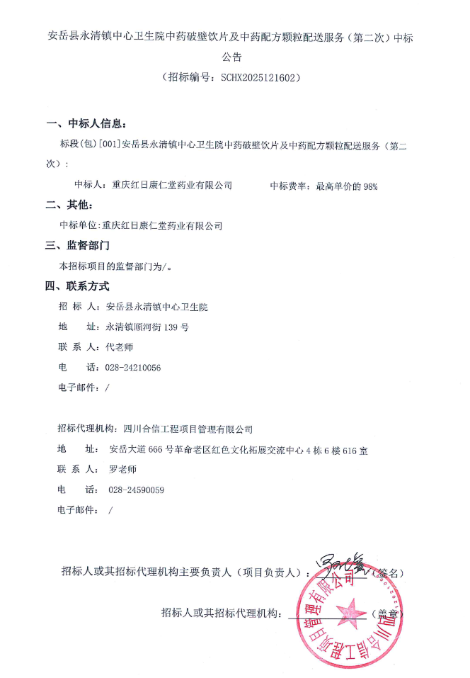 【资阳市安岳县永清镇中心卫生院】四川省资阳市安岳县永清镇中心卫生院中药破壁饮片及中药配方颗粒配送服务(第二次)中标公告