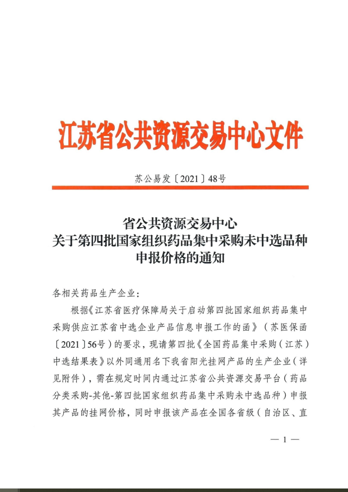 【江苏】2021年江苏省公共资源交易中心关于第四批国家组织药品集中采购未中选品种申报价格的通知 苏公易发[2021]48号