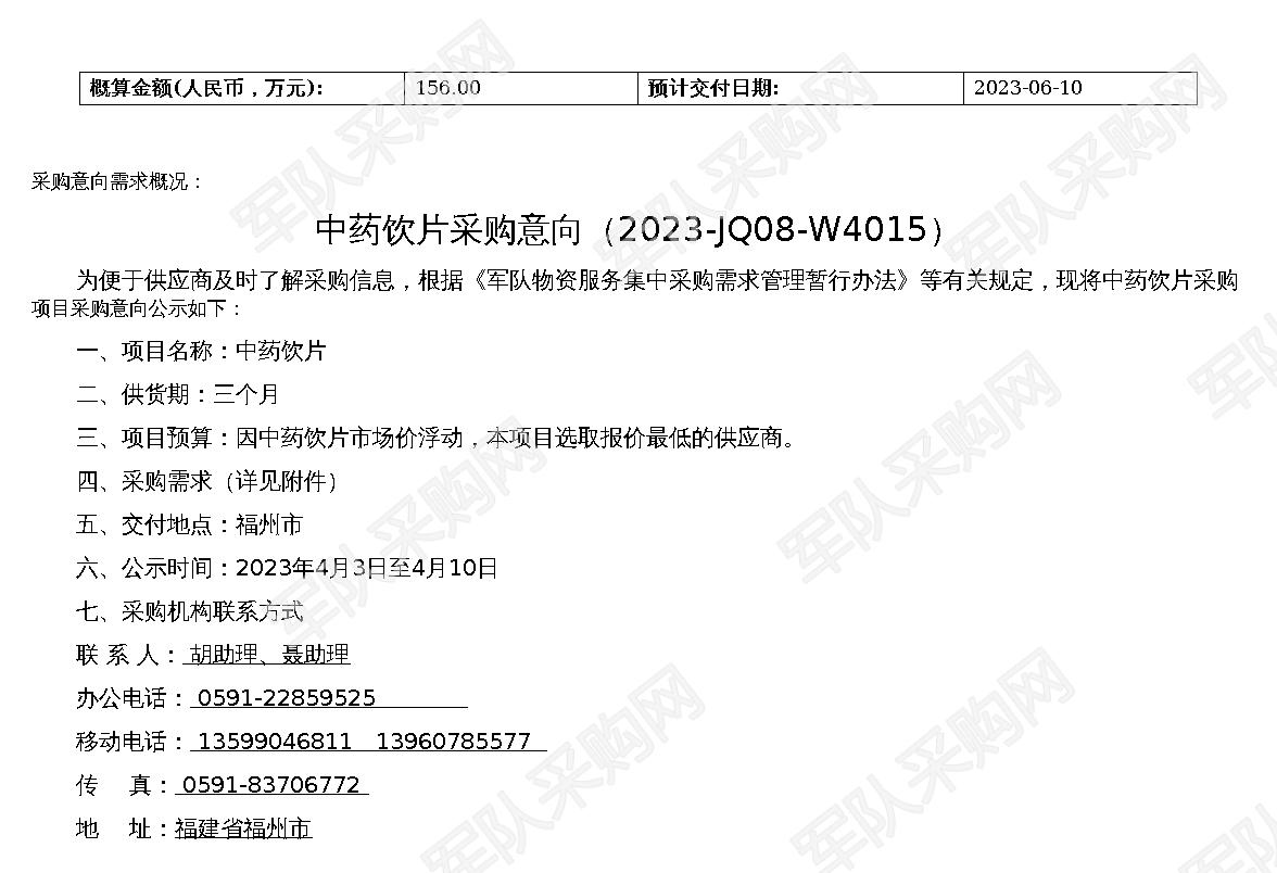 【军队采购】军队采购网中药饮片采购意向(2023-JQ08-W4015)