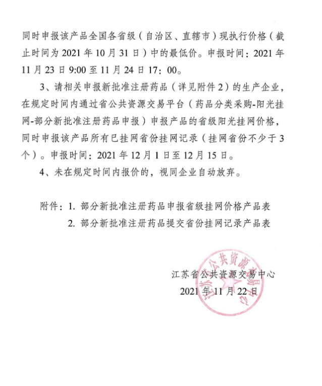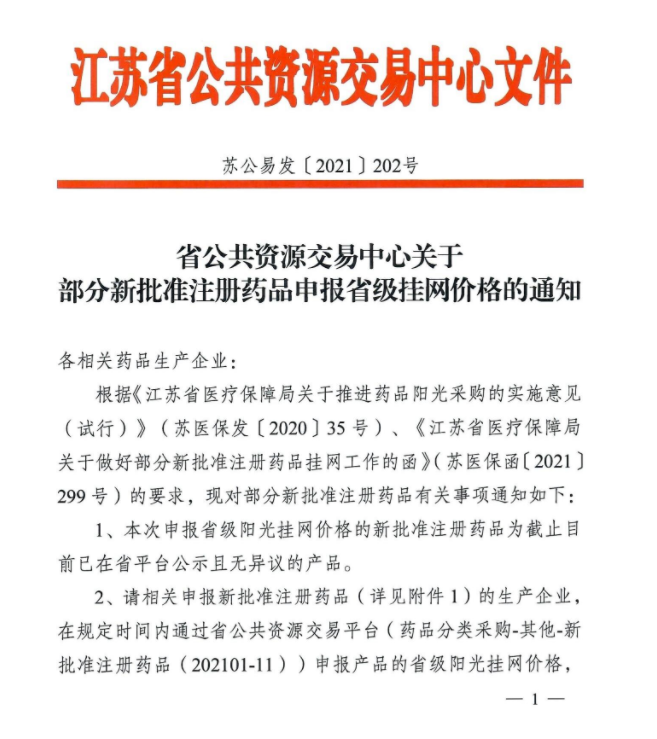 【江苏】江苏省公共资源交易中心关于部分新批准注册药品申报省级挂网价格的通知(20211122)
