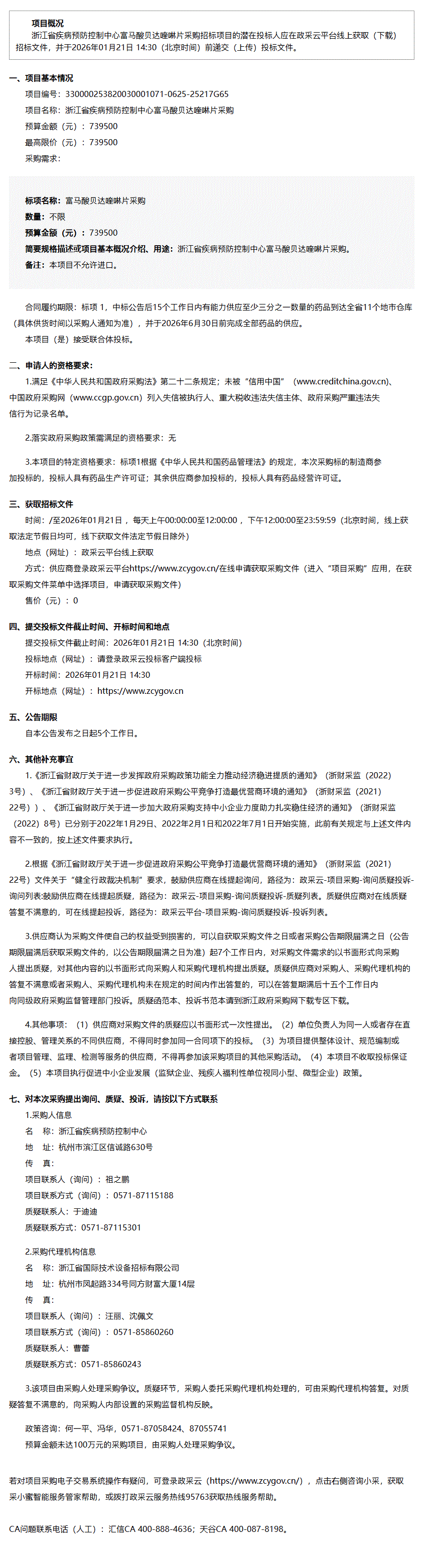 【浙江省疾病预防控制中心】浙江省疾病预防控制中心富马酸贝达喹啉片采购公开招标公告