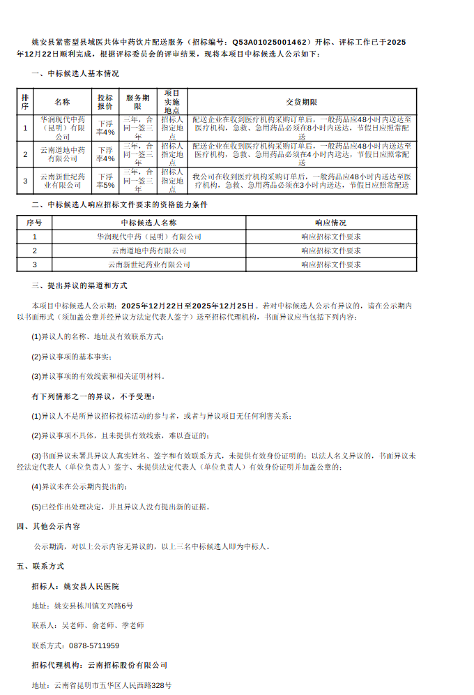 【楚雄彝族自治州姚安县人民医院】云南省楚雄彝族自治州姚安县紧密型县域医共体中药饮片配送服务中标候选人公示