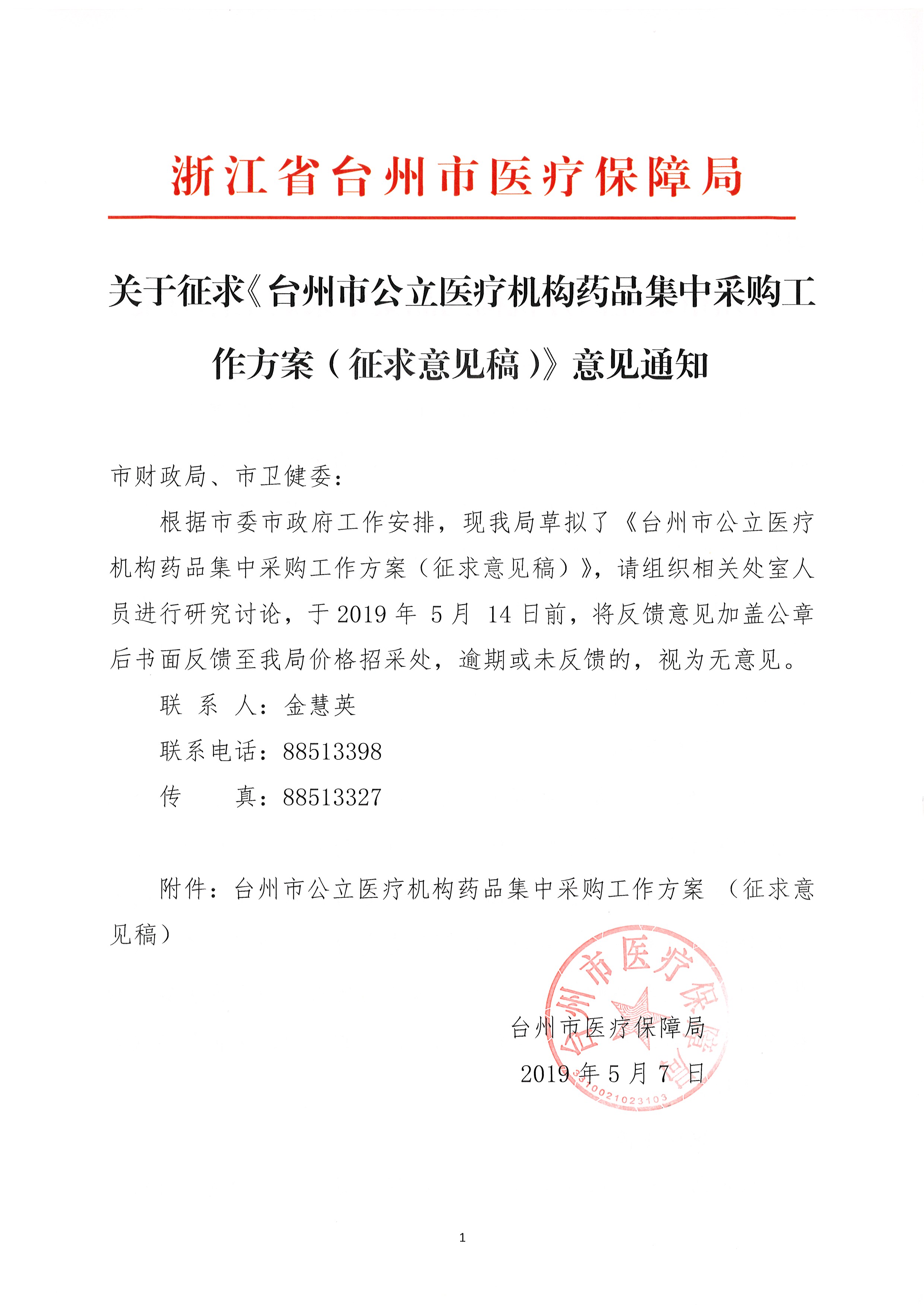 【台州】浙江省关于征求《台州市公立医疗机构药品集中采购工作方案(征求意见稿)》意见通知
