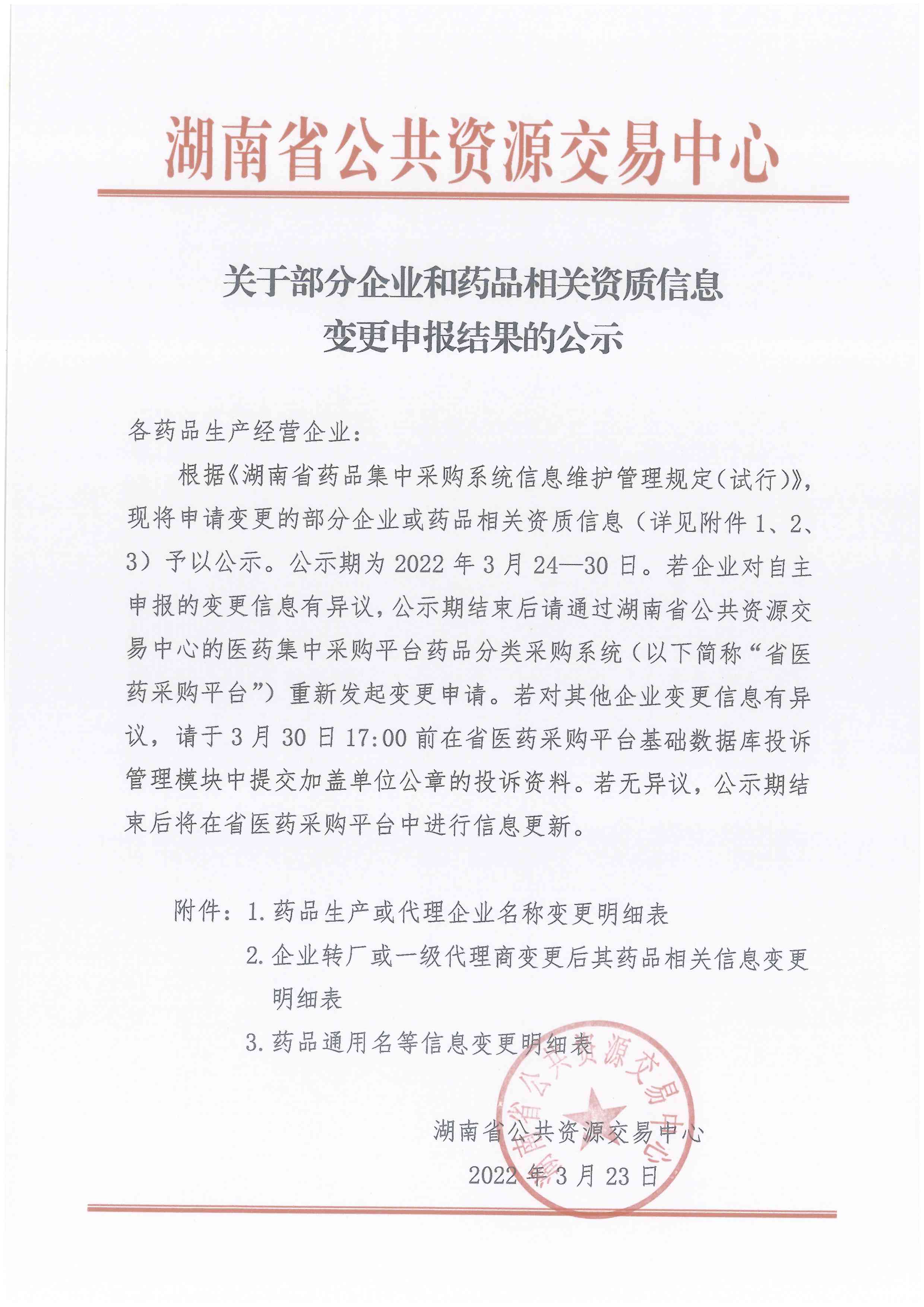【湖南】关于部分企业和药品相关资质信息变更申报结果的公示