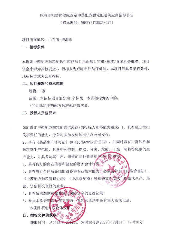 【威海市妇幼保健院】山东省威海市妇幼保健院选定中药配方颗粒配送供应商招标公告(20251224)