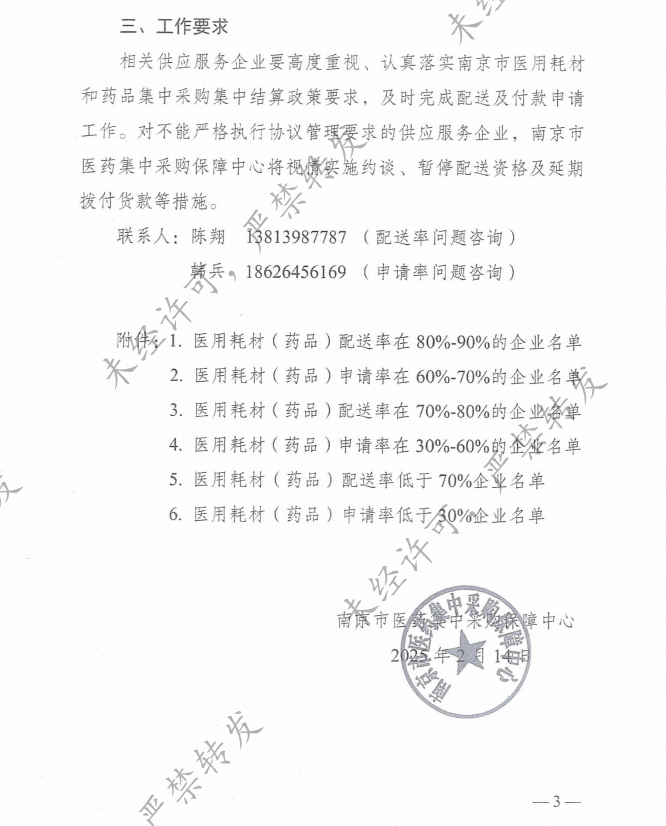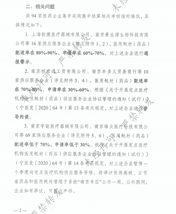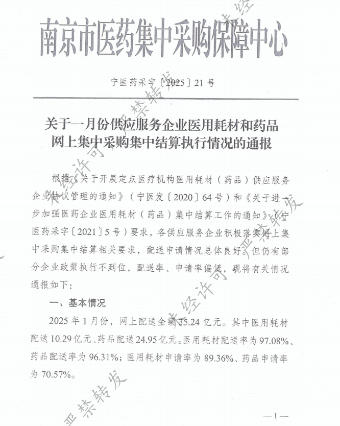 【南京】宁医药采字〔2025〕21号-关于一月份供应服务企业医用耗材和药品网上集中采购集中结算执行情况的通报