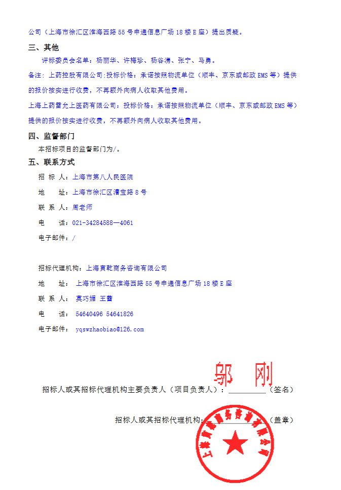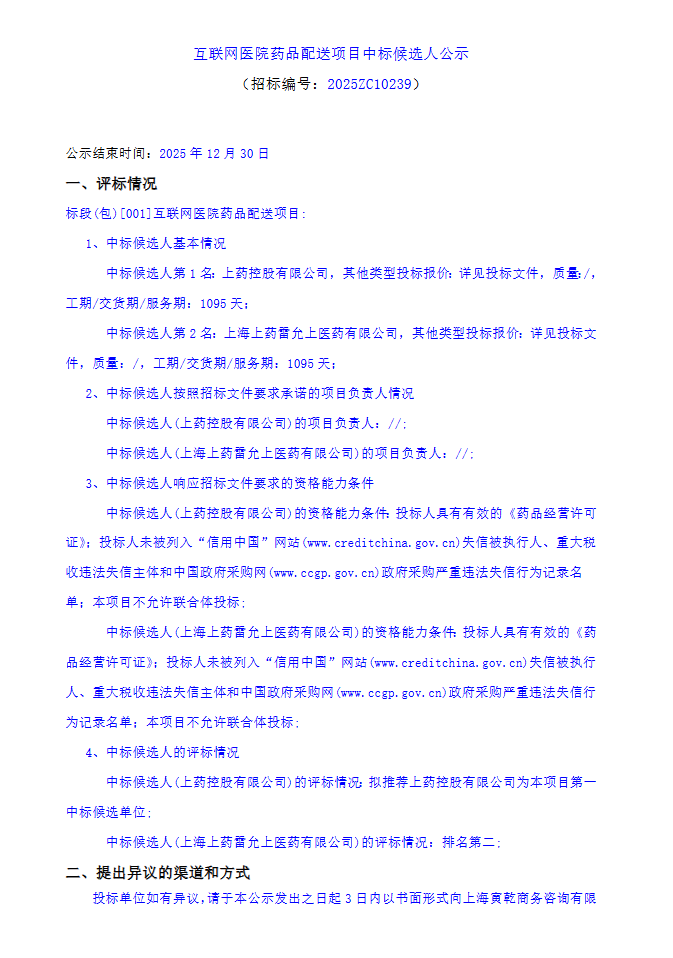 【上海市第八人民医院】上海市第八人民医院互联网医院药品配送项目中标候选人公示