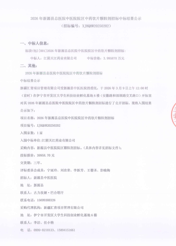 【伊犁哈萨克自治州新源县中医医院】新疆维吾尔自治区2026年新源县总医院中医院院区中药饮片颗粒剂招标中标结果公示