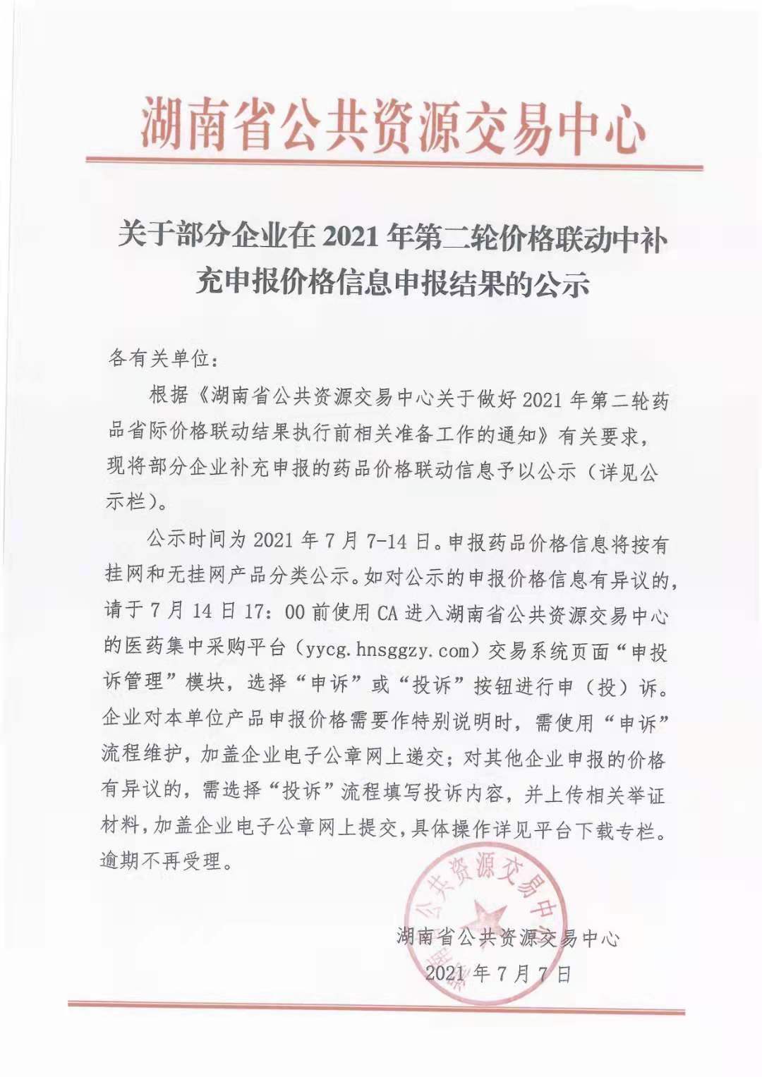 【湖南】2021年湖南省关于部分企业在2021年第二轮价格联动中补充申报价格信息申报结果的公示
