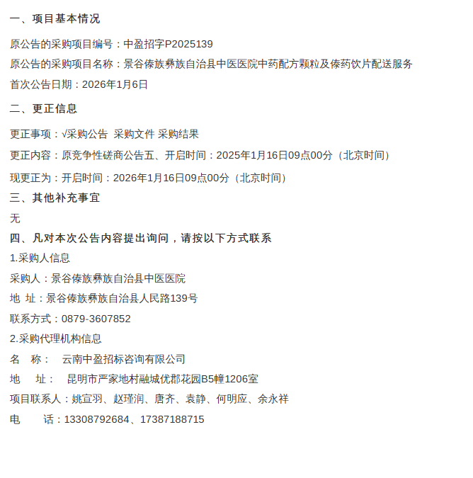 【普洱市景谷傣族彝族自治县中医医院】云南省普洱市景谷傣族彝族自治县中医医院中药配方颗粒及傣药饮片配送服务竞争性磋商更正公告