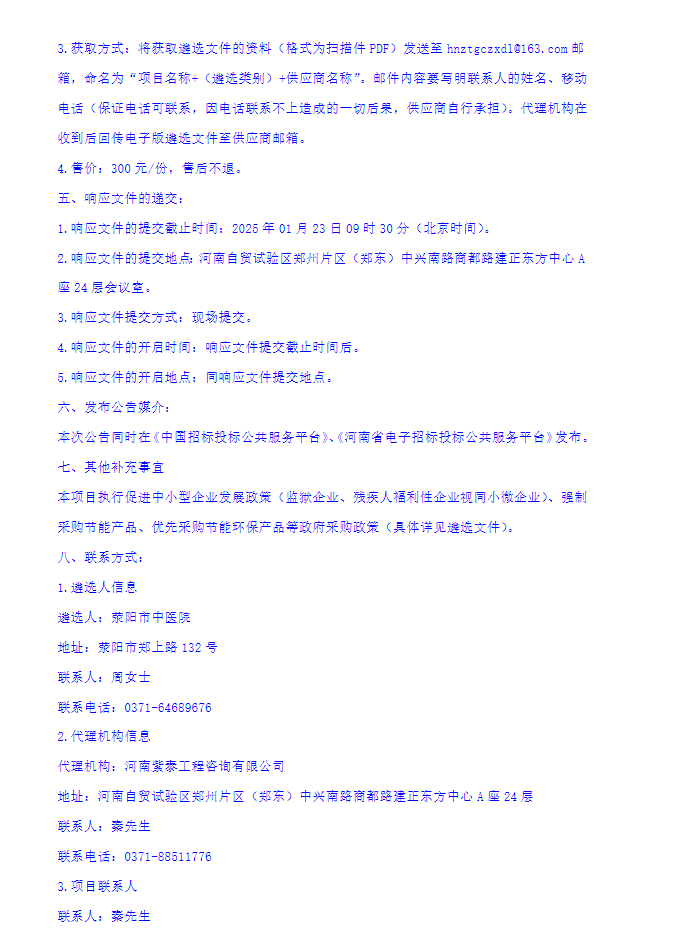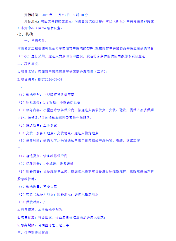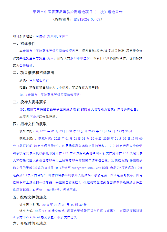 【郑州市荥阳市中医院】河南省郑州市荥阳市中医院药品等供应商遴选项目(二次)遴选公告