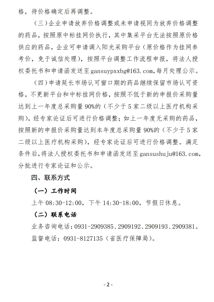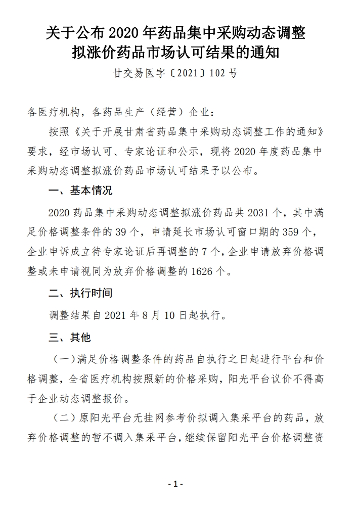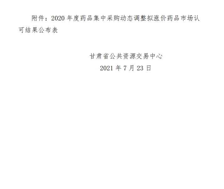 【甘肃】甘肃省关于公布2020年药品集中采购动态调整拟涨价药品市场认可结果的通知