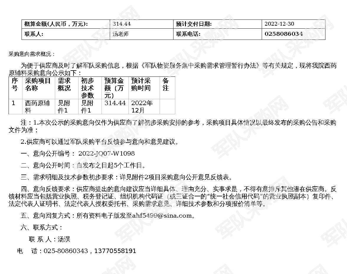 【军队采购网】西药原辅料采购意向公开(2022-JQ07-W1098)