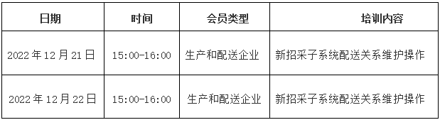 为做好国家医疗保障信息平台药品和医用耗材招采管理子系统(以下简称新招采子系统)省级带量采购配送关系维护工作,我中心将于2022年12月21日-22日举办新招采子系统配送关系维护操作线上培训,现将有关事项通知如下: