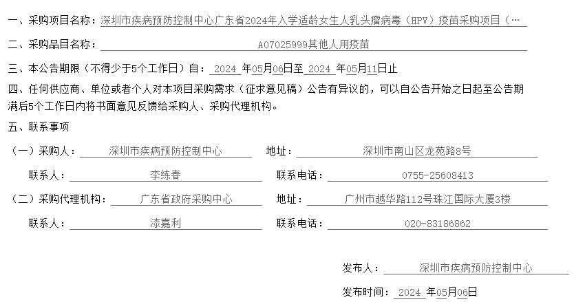 【深圳市疾病预防控制中心】广东省深圳市疾病预防控制中心广东省2024年入学适龄女生人乳头瘤病毒(HPV)疫苗采购项目(深圳市疾病预防控制中心)采购需求征求意见公告